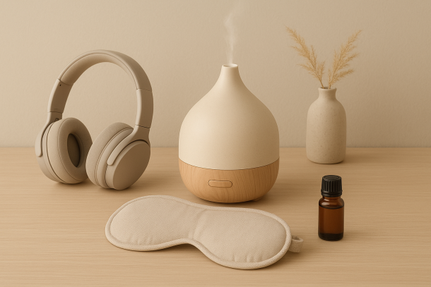 Kits de méditation (casques audio...), diffuseurs huiles essentielles, masques de relaxation (Thermiques, chauffants, ou rafraîchissants...)