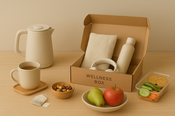 Espaces "tisanerie" avec boissons relaxantes, box bien-être pour salariés (kits relaxation, goodies santé), alimentation saine au bureau (fruits frais, snacks équilibrés)...