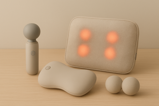 Appareils de massage portatifs, coussins massants électriques, balles d'auto massage...
